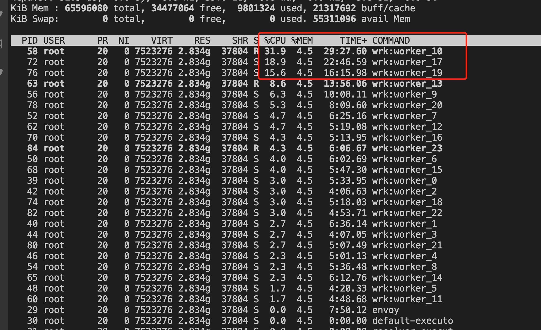 Envoy 进程使用的多个 CPU 之间的工作负载不均衡。如下图所示,Ingress Gateway 中一共有 24 个 Worker,但只有三个 worker 的 CPU 使用率较高,其他 CPU 使用率很低。