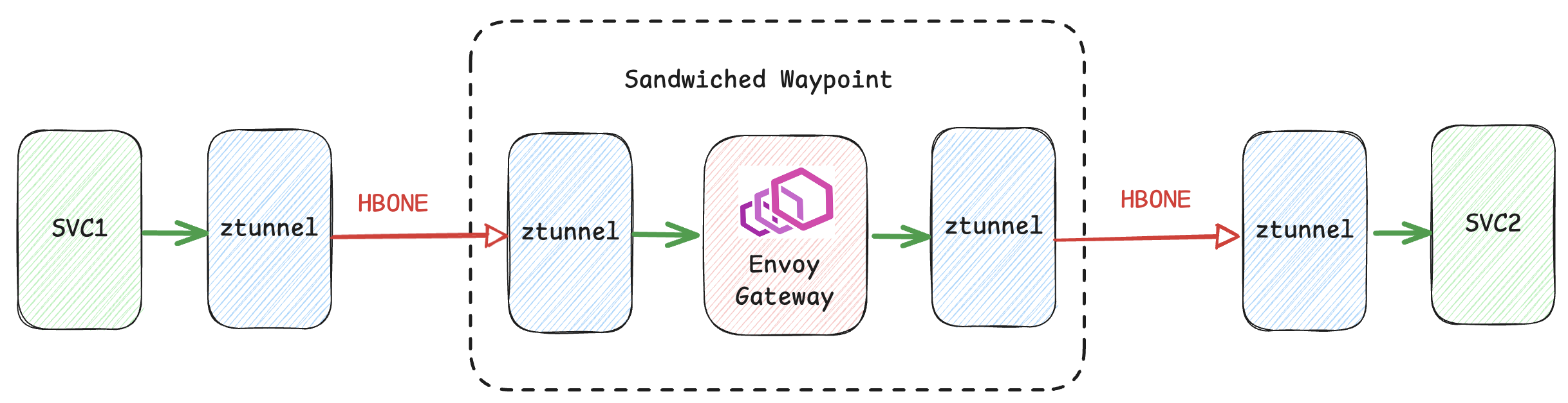 This also makes it possible to use Envoy Gateway as the Ingress Gateway for Ambient Mesh. The only difference is that the ztunnel needs to be placed only after Envoy Gateway (not in front), since incoming traffic originates outside the mesh and doesn’t arrive over an HBONE tunnel.